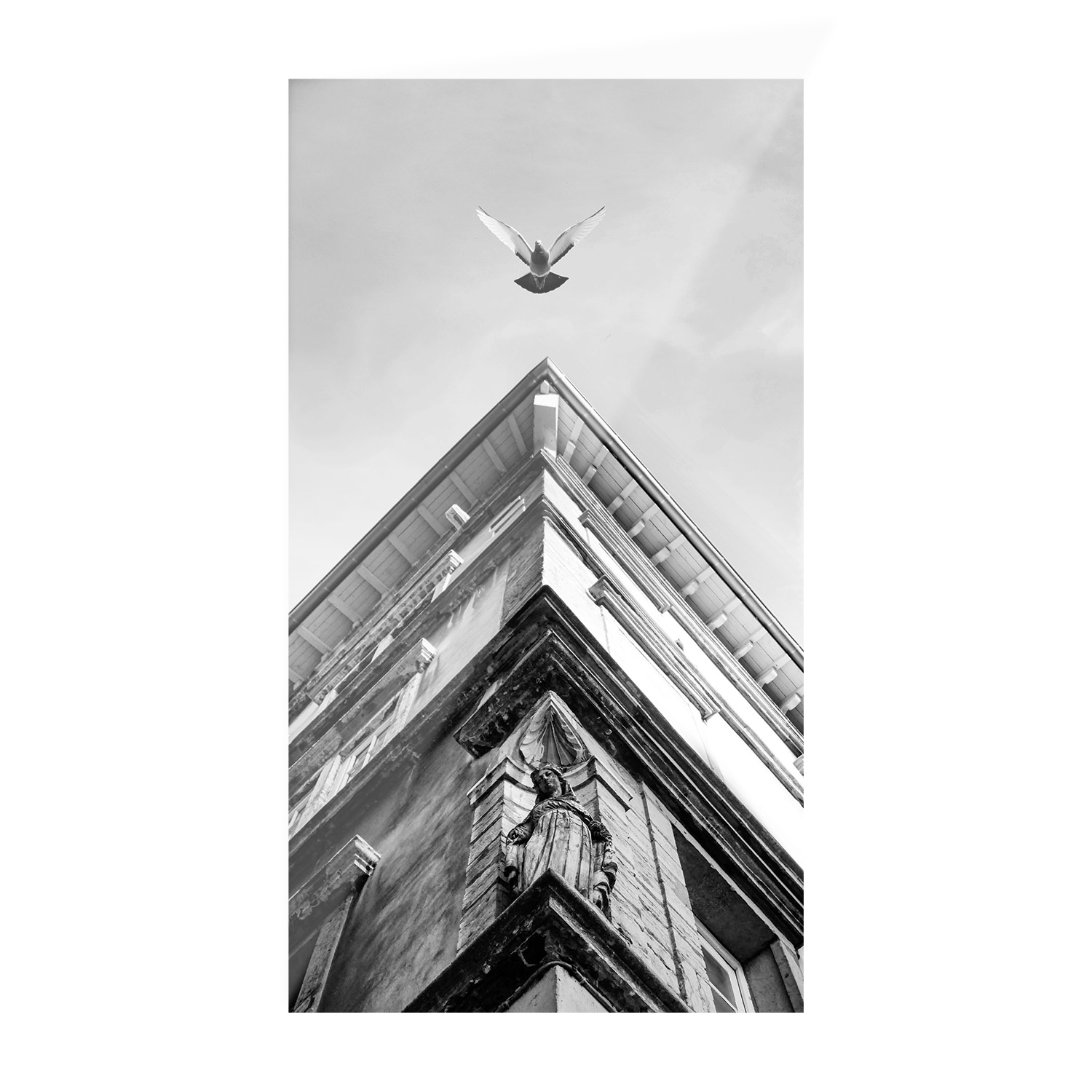 En observant le contraste entre les lignes architecturales et la délicatesse des ailes du pigeon, vous ressentirez une sensation d’espace. La profondeur de la perspective vers le ciel crée une atmosphère contemplative, idéale pour des moments de détente. Chaque regard sur cette œuvre rappelle la beauté discrète de Lyon, apportant un sentiment de calme à votre quotidien.